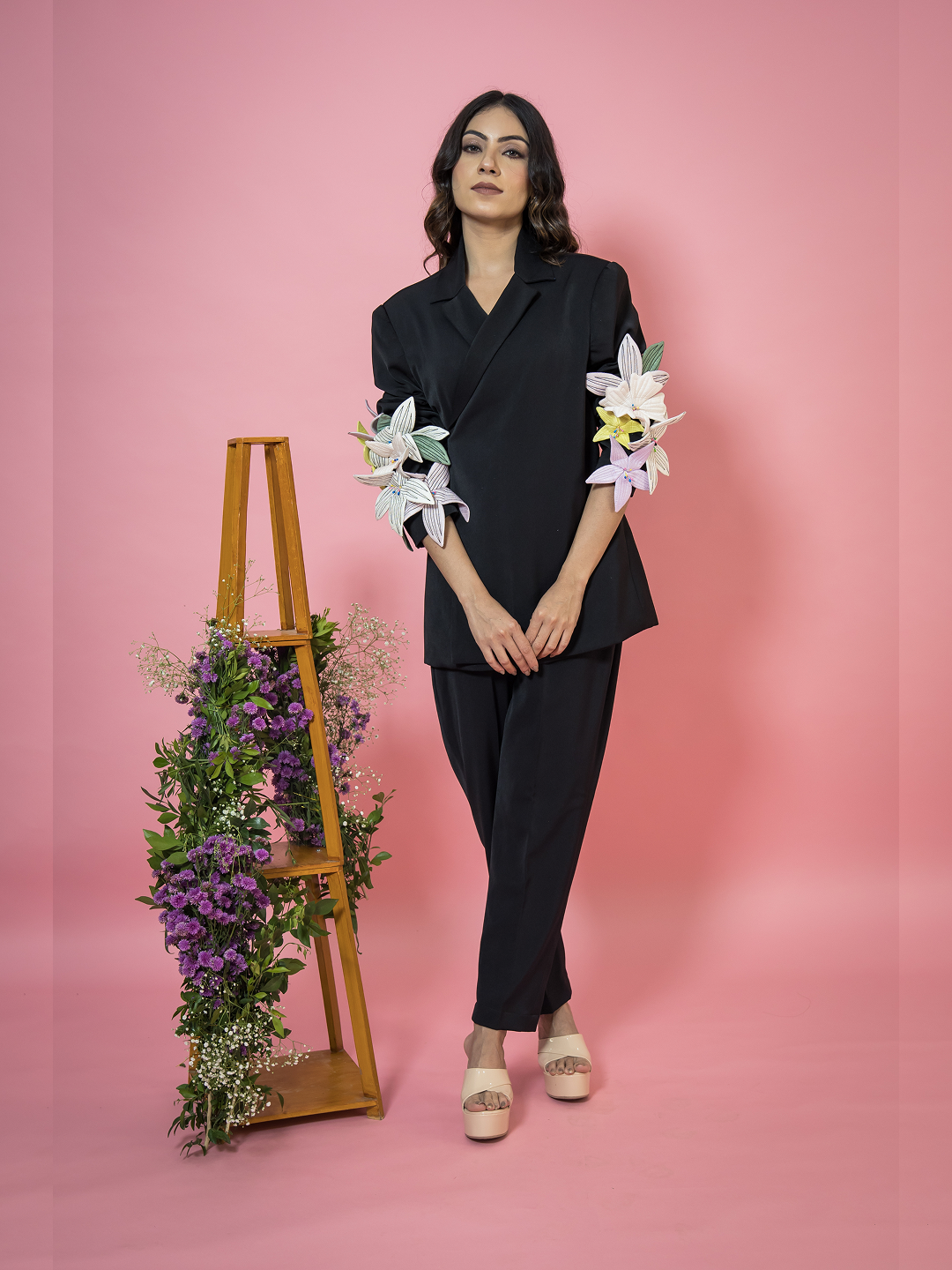 Top: Tailored blazer designed with a refined structure, highlighted by striking 3D floral detailing on the sleeves for an elegant statement