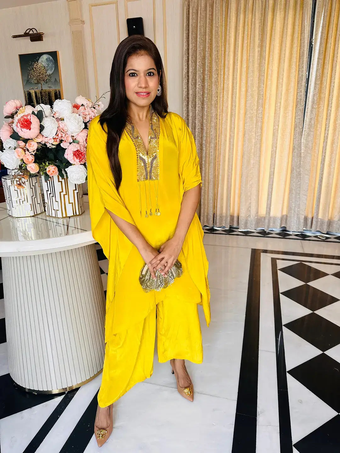 Top: Amber gold silk satin kaftan featuring a fluid drape with a soft, luminous finish