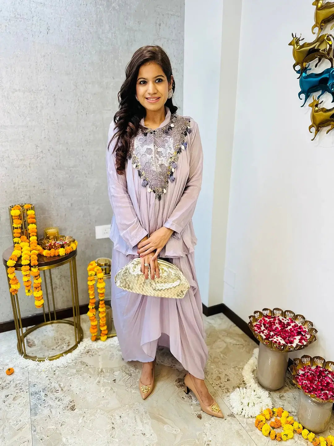 Top: Mauve georgette shirt adorned with boho-inspired neck embroidery, adding a chic, statement detail