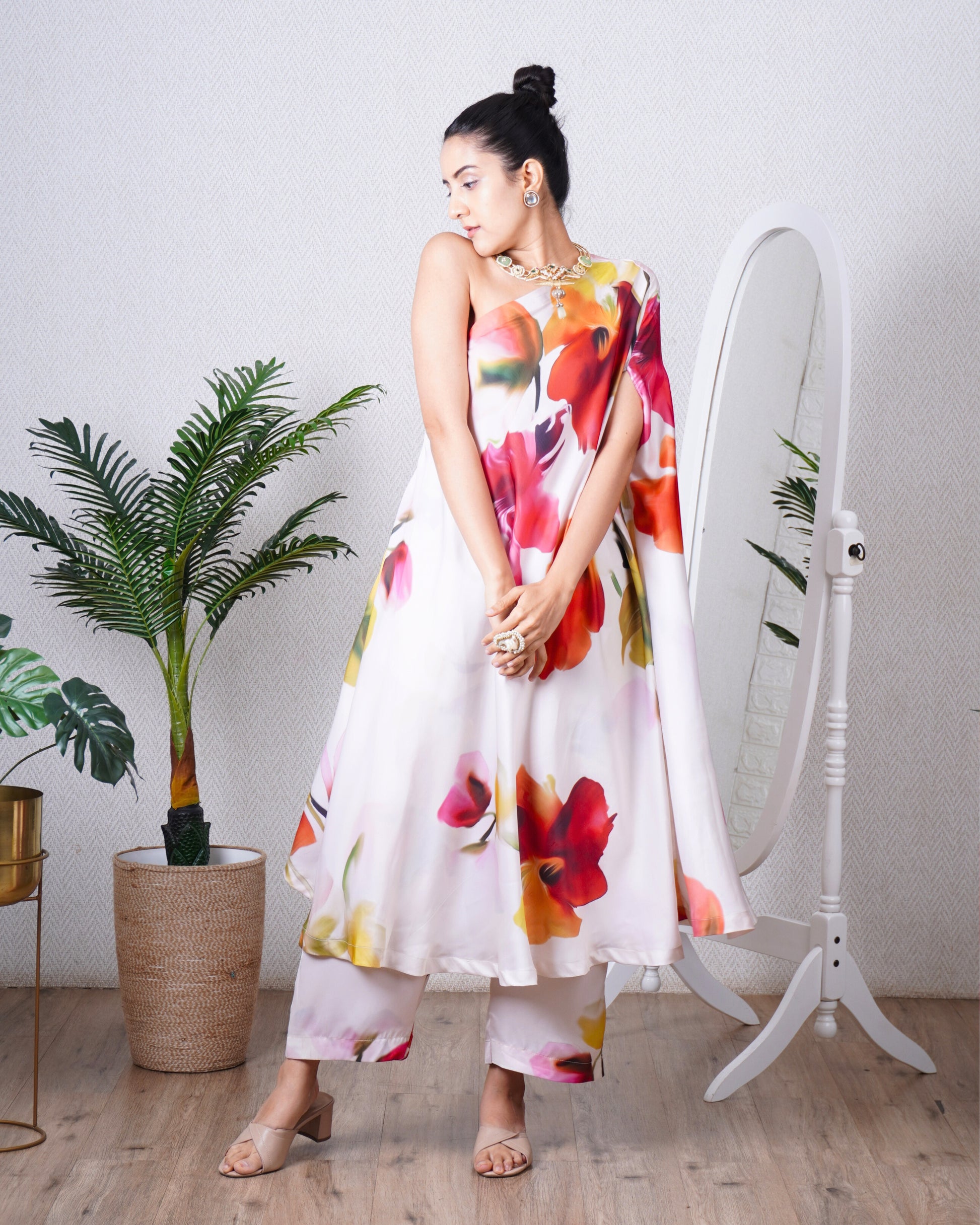 Top: Multi-colour printed one-shoulder kaftan in luxurious Armenian silk, designed with an oversized free-fall silhouette for effortless style and all-day comfort. Can also be worn solo as a dress for a bold, western-inspired look